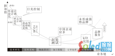 微笑到哭泣曲線LED產(chǎn)業(yè)也在經(jīng)歷,這是一組關(guān)于LED產(chǎn)業(yè)鏈附加值與業(yè)務(wù)鏈的微笑曲線圖,可以看出高附加值的外延芯片環(huán)節(jié)基本上被日美控制,也就是說這個(gè)環(huán)節(jié)的核心技術(shù)掌握在日美企業(yè)手中,雖然中國擁有巨大的規(guī)模,但始終處在加工組裝的低端環(huán)節(jié),處于最低利潤的競(jìng)爭(zhēng)環(huán)節(jié),可見未來向著品牌方向發(fā)展成為必然趨勢(shì)。