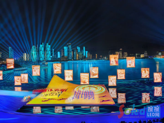 移動LED顯示矩陣,配合著現(xiàn)場節(jié)目場景,時(shí)而變成一個(gè)個(gè)滿天飛舞的光影,時(shí)而成為一塊塊記錄歷史的照片,不斷變換著隊(duì)形,最終變成全運(yùn)會主題,贏得全場掌聲。