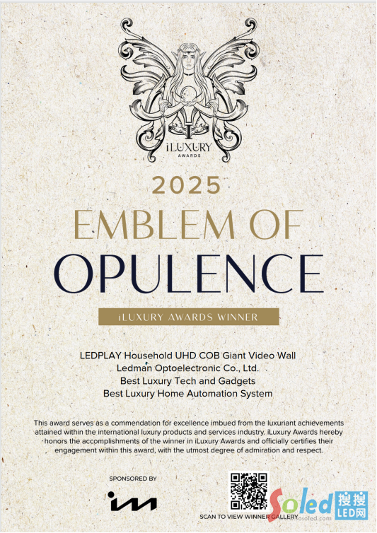 顏值與實力并存,讓這款產(chǎn)品斬獲國際奢侈品設計界的 “奧斯卡”——iLuxury Awards 獎。該獎項由國際知名機構(gòu) IAA 主辦,以 “極致美學、稀缺價值、人文匠心” 為核心評審標準,雷曼巨幕墻憑借超薄機身、隱藏式線路設計和無邊框全嵌入安裝,完美融入各類家裝風格,宛如客廳中靈動的藝術(shù)畫框,實現(xiàn)了科技與美學的無縫銜接。