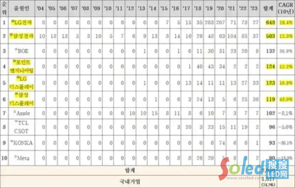 從主要申請人來看,LG電子(648件)和三星電子(503件)的申請量分別位列全球第一和第二。此外,LG Display(147件,第三)、三星Display(132件,第五)、Point Engineering(124件,第六)等五家韓國企業(yè)躋身全球前十大多產(chǎn)申請人行列,表現(xiàn)突出。