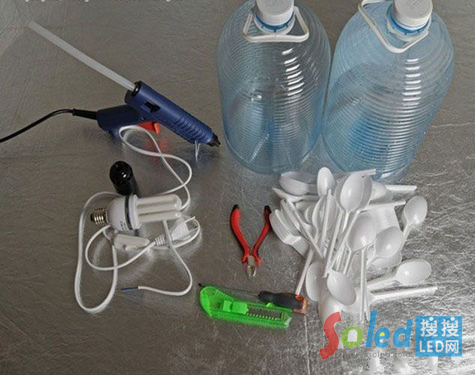 首先,你需要準備膠條、膠槍、剪刀、鉗子、燈泡、空水桶和一團電線。