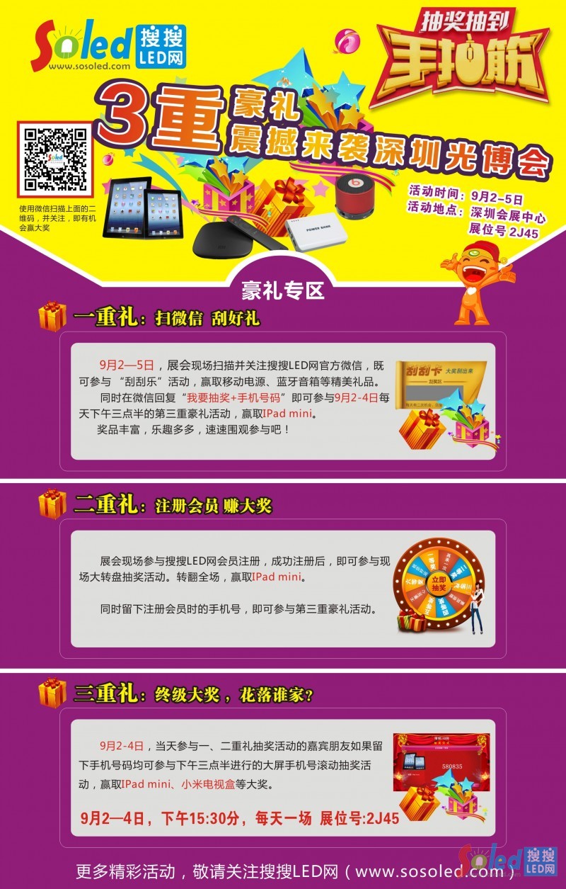 這是繼廣州國際照明展、上海照明展之后搜搜LED網(wǎng)第三次攜大獎空降展會現(xiàn)場,第一輪在廣州國際照明展上,搜搜LED網(wǎng)的“掃微信抽大獎”活動取得圓滿成功,搜搜LED網(wǎng)官方微信后臺數(shù)據(jù)顯示,有超過30000人參與了我們的抽獎活動,綜合中獎率在80%以上;第二輪在七月上海照明展上搜搜LED網(wǎng)“掃微信抽大獎”活動再次人氣爆棚,抽獎參與人次超過10000人。