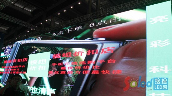 亮彩科技本次光博會推出了LED行業(yè)內(nèi)首推的網(wǎng)絡(luò)LED顯示屏的交易平臺。走近亮彩的展位,首先,一堵城墻般令人震撼的超大LED顯示屏呈現(xiàn)在眼前,你會感覺被帶到一個神奇的由LED光色主宰的世界,然后,你會看到在變幻的畫面中定格著幾行字:“模組折扣店”、“手機在線選購平臺”、“最優(yōu)性價比”、“最優(yōu)惠最方便最快捷”。這是什么呢?接下來,會有新穎的東西介紹給你。亮彩科技王輝表示,我們開發(fā)了一個APP的網(wǎng)絡(luò)商城,業(yè)內(nèi)首推的一個類似京東的LED顯示屏的網(wǎng)絡(luò)商城。這是一個全新的交易模式,你只要下載我們的軟件進(jìn)去,就能夠直接下單、購買LED顯示屏。只要你下單,我們就直接給你出貨,省去了傳統(tǒng)的簽合同、查訂期、查交期等一系列的流程。亮彩科技敢于做出“五點下單,六點出貨”的承諾。