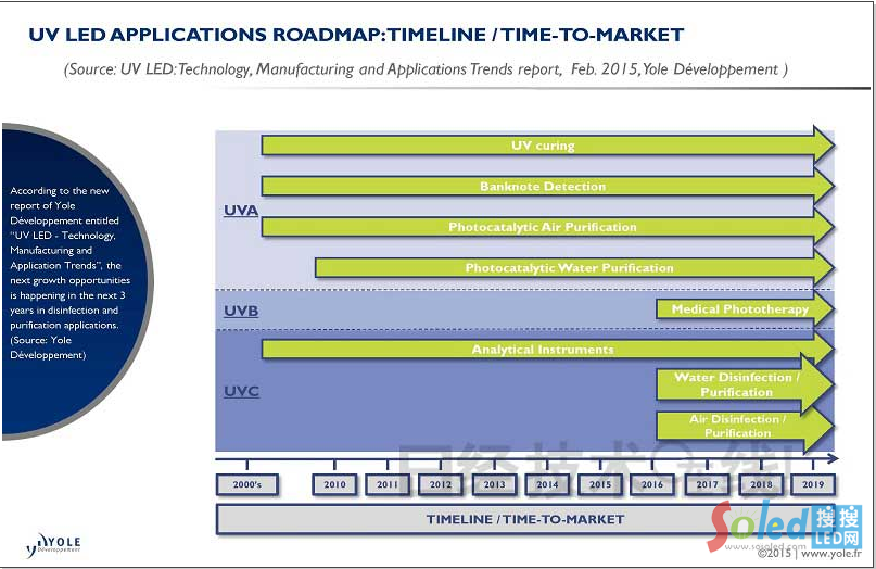 在這方面,可視光LED業(yè)界培育的專(zhuān)業(yè)知識(shí)也可發(fā)揮作用。針對(duì)UV LED相關(guān)技術(shù),Yole在最新報(bào)告中總結(jié)了發(fā)展藍(lán)圖,通過(guò)導(dǎo)入這些技術(shù),UV LED便有望開(kāi)辟出新的用途。UVLED技術(shù)如今正在步入非常強(qiáng)勁的增長(zhǎng)領(lǐng)域。