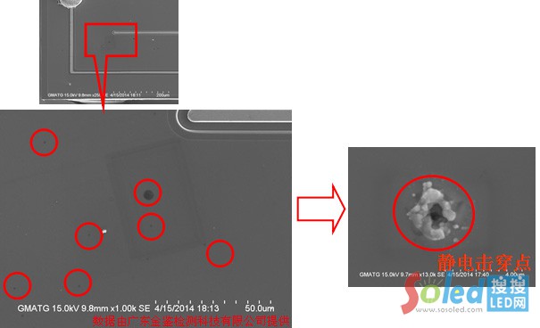 某客戶生產的一批燈珠出現(xiàn)漏電問題,委托金鑒查找原因。金鑒通過掃描電鏡鑒定這批燈珠漏電原因為靜電擊穿,并對供應商提供的裸晶進行檢測,發(fā)現(xiàn)芯片外延層表面有大量黑色空洞,這些缺陷表明外延層晶體質量較差,PN結內部存在缺陷?斩吹陌l(fā)現(xiàn),幫助客戶明確責任事故的負責方,替客戶挽回損失。
