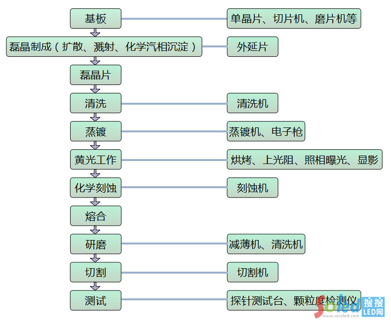 外延片→清洗→鍍透明電極層→透明電極圖形光刻→腐蝕→去膠→平臺圖形光刻→干法刻蝕→去膠→退火→SiO2沉積→窗口圖形光刻→SiO2腐蝕→去膠→N極圖形光刻→預清洗→鍍膜→剝離→退火→P極圖形光刻→鍍膜→剝離→研磨→切割→芯片→成品測試。