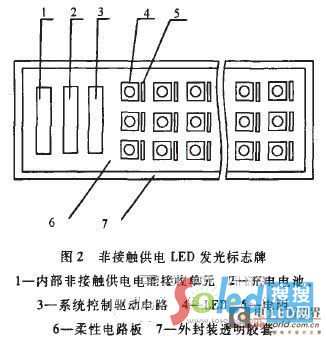 本文設(shè)計的非接觸供電LED發(fā)光標(biāo)志牌(如圖2所示),它由內(nèi)部非接觸供電電能接收單元、充電電池、LED、LED驅(qū)動電路、系統(tǒng)控制電路、柔性電路板、外封裝透明膠套構(gòu)成。外部由非接觸供電電能發(fā)送單元及電源構(gòu)成。