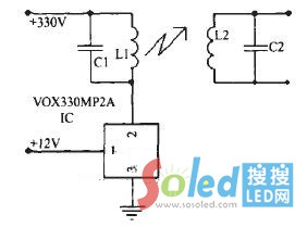 VOX330MP05S是一款專門針對市電電源的非接觸供電的大功率發(fā)射模塊芯片,可以將市電整流后直接給芯片供電,工作電壓范圍大,最低可低至IOOV,最高電壓至400V,具有高達(dá)1A的電流發(fā)射能力,典型工作電路(如圖3所示)。Ic內(nèi)部建有振蕩、基準(zhǔn)電壓、脈寬調(diào)制、限幅、低壓啟動、輸出推動和功率輸出等電路,完全符合電磁共振的特殊要求;V0330MP05s自身功耗小,輸出電流大,發(fā)射效率高達(dá)70%以上;芯片內(nèi)設(shè)自動限流電路,電路在空載時電流很小,而在大負(fù)載時的輸出能力可達(dá)空載時的十倍以上;VOX330MP05S外圍電路簡單,主要元件只有一個電阻、一個電容和~個線圈,因此使用方便。配合相應(yīng)的接收模塊同時使用,就能實現(xiàn)非接觸供電。