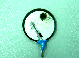 壓敏電阻對于瞬態(tài)浪涌脈沖進行電流泄放,多次泄放以后壓敏電阻的介質(zhì)ZnO會發(fā)生特性變化,這樣壓敏電阻的殘壓特性、泄放能力都會大大降低;更加嚴重的是壓敏電阻這種兩面鍍銀結(jié)構(gòu),表面鍍銀并無法實現(xiàn)100%均勻,那就說明每次瞬態(tài)浪涌沖擊,必然會存在整個壓敏電阻的表面有某個點最先導通,最先擊穿導通的點在承受多次沖擊之后,后首先燒毀,最終導致壓敏電阻損壞(見下圖)。