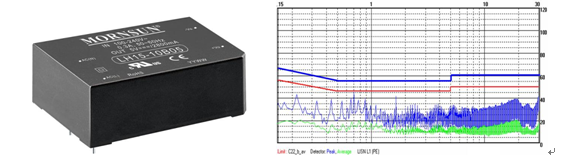 上圖為MORNSUN電源LH15-10B05的電源應(yīng)用到某品牌產(chǎn)品上面后,整機測試傳導騷擾結(jié)果,此結(jié)果無法符合EN55022/CISPR22的CLASS B要求,甚至連CLASS A都無法滿足要求,更不用說設(shè)計余量。