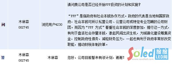 木林森周二(23日)在全景網互動平臺表示,公司目前暫未有計劃參與PPP項目的投資和實施。