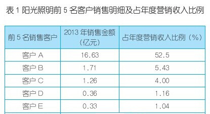 陽光照明2013年年報顯示,其前5名客戶的收入占整體收入的64.13%,達到20.32億元。其中最大的客戶業(yè)績貢獻比例達到52.50%,達到16.63億元(見表1)。