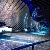 展館中央的這個(gè)巨型動(dòng)態(tài)鏡面裝置,重量為6噸,立面的部分是由36個(gè)動(dòng)態(tài)鏡面葉片組成,地面是LED超大屏,通過反射原理,將地面屏幕中的內(nèi)容反射到鏡面上,這可以實(shí)現(xiàn)像海浪一樣的視覺效果,將LED屏幕中的內(nèi)容更生動(dòng)立體的展示出來。