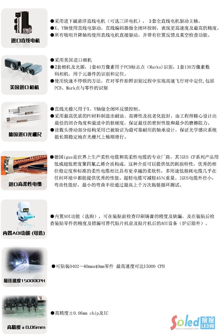 ● 滿足國內(nèi)電子廠、SMT加工廠、LED應(yīng)用廠商,LED燈具廠商貼裝LED3528,5050,3014 , 0402,0603、0805、1206、1210,1W大功率,3W大功率,IC等器件、封裝器件二級管、三極管等,有效的提高了貼裝的精度和效率,節(jié)省大量人工成本。